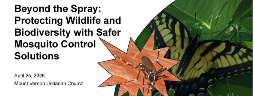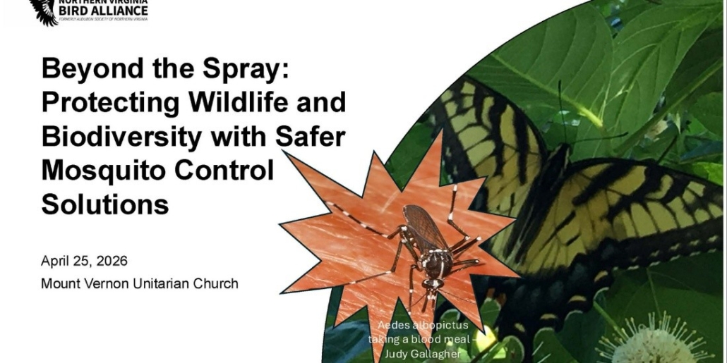 Liz Train, NVBA’s Fairfax County Wildlife Sanctuary Program Coordinator, will give a presentation on mosquito control solutions that avoid pesticides. She will review the research on harms to wildlife caused by broadcast spraying for mosquitoes and talk about alternative (and more effective) methods to reduce mosquito populations. NVBA urges homeowners to consider the long-term health of their yards, ecosystems, and communities, and “Say No to the Spray.” The Wildlife Sanctuary Program promotes healthy, pesticide-free habitats that nurture biodiversity from the soil up.